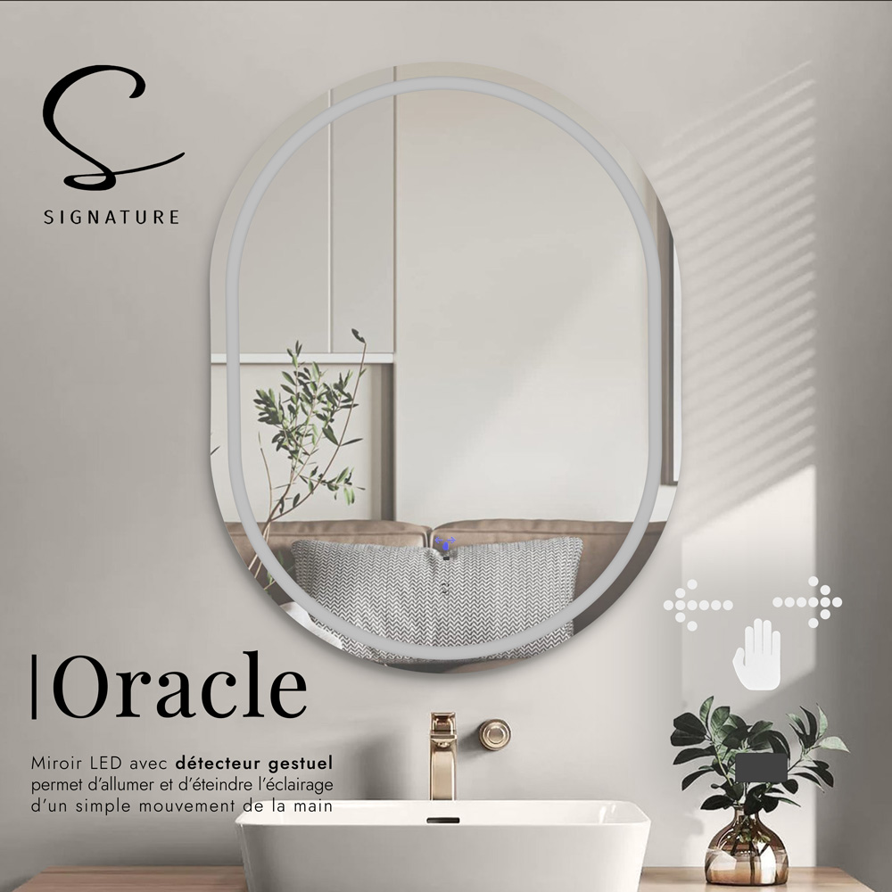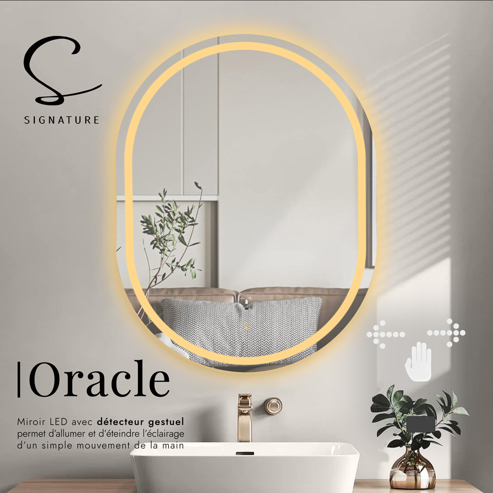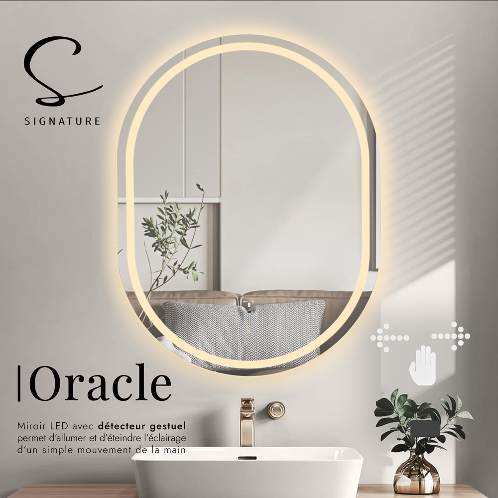 “Miroir ORACLE 80×60 cm en acrylique ultra-fin avec LED intégrée. Contrôle gestuel intuitif (allumage/extinction par mouvement de main) et 3 modes d’éclairage (blanc froid, chaud, neutre). Design sans cadre pour une intégration moderne.”