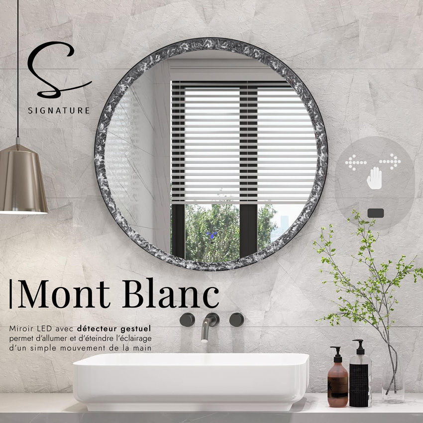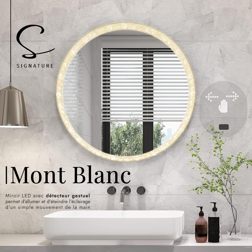 “Le miroir MONT BLANC combine élégance et innovation avec son cadre lumineux et sa technologie gestuelle. D’une simple main, contrôlez son éclairage LED pour une ambiance parfaite. Un mariage réussi entre design raffiné et fonctionnalité intelligente.”